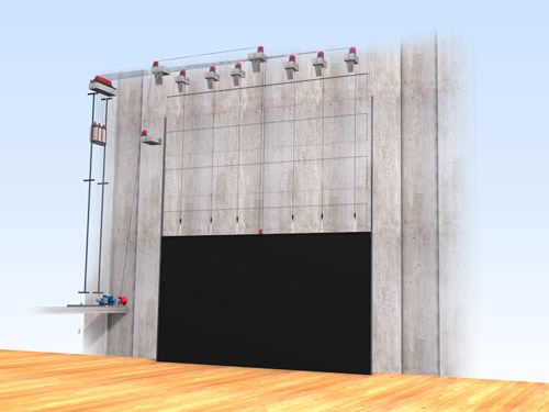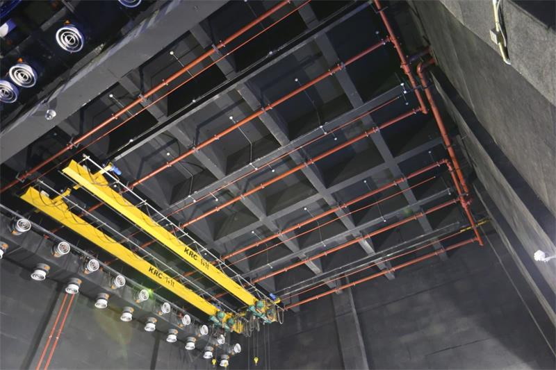 側(cè)臺(tái)裝景行車(chē)位于左右兩側(cè)側(cè)舞臺(tái)上空。行車(chē)用于大型或重型布景部件的裝配。